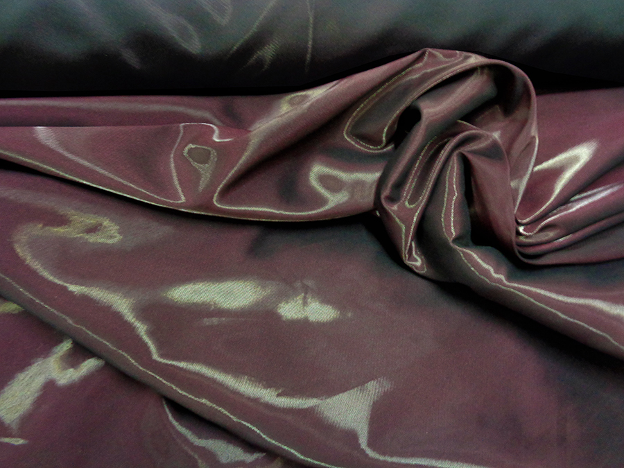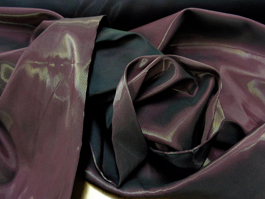 ARMANI STOCK (NO FIRMATO, NO CORREDATO DA ETICHETTE) ESCLUSIVO TESSUTO IN RASO / TAFFETA’ DOUBLEFACE CON LAVORAZIONE CANGIANTE EFFETTO ACQUA DALLA PARTE PRUGNA. DAL LATO NERO LAVORAZIONE UNITA SATINATA. TESSUTO PESO MEDIO, COPRENTE, LEGGERO, CROCCANTE, SEMIRIGIDO. I PARTICOLARI RIFLESSI NEL TAFFETA’ CANGIANTE SONO OTTENUTI USANDO CATENA NERA E METALLO. INDICATO PER: ABBIGLIAMENTO.