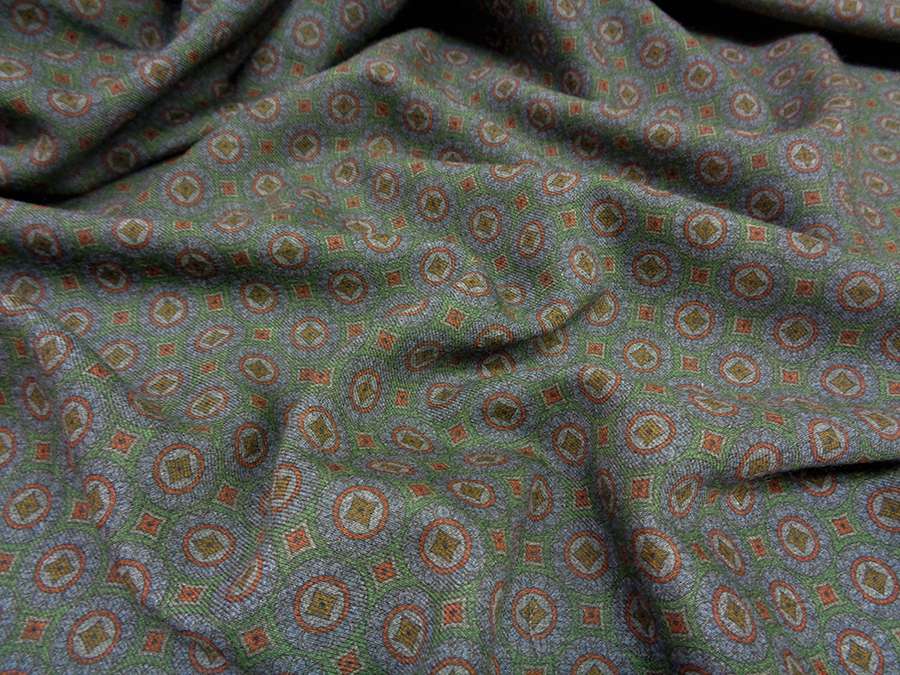 PREGIATA ED ESCLUSIVA SAGLIETTA IN PURA LANA DOUBLEFACE, MORBIDA, CALDA, LEGGERA ED OPACA FONDO VERDE SALVIA MELANGE CON DISEGNI CRAVATTA SUI TONI DEL GRIGIO, VERDE E ZUCCA. DALL’ALTRO LATO GRIGIO MEDIO MELANGE IN TINTA UNITA DA UTILIZZARE PER BORDATURE O PROFILI. POSSIBILITA’ DI UTILIZZO DA AMBO I LATI. TESSUTO UNISEX INDICATO PER: CASACCHE, CAMICIE, VESTAGLIE, GONNE, PIGIAMI DA CASA, ABITI, PANTALONI MORBIDI, ECC..