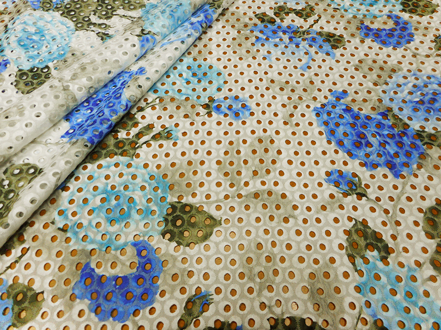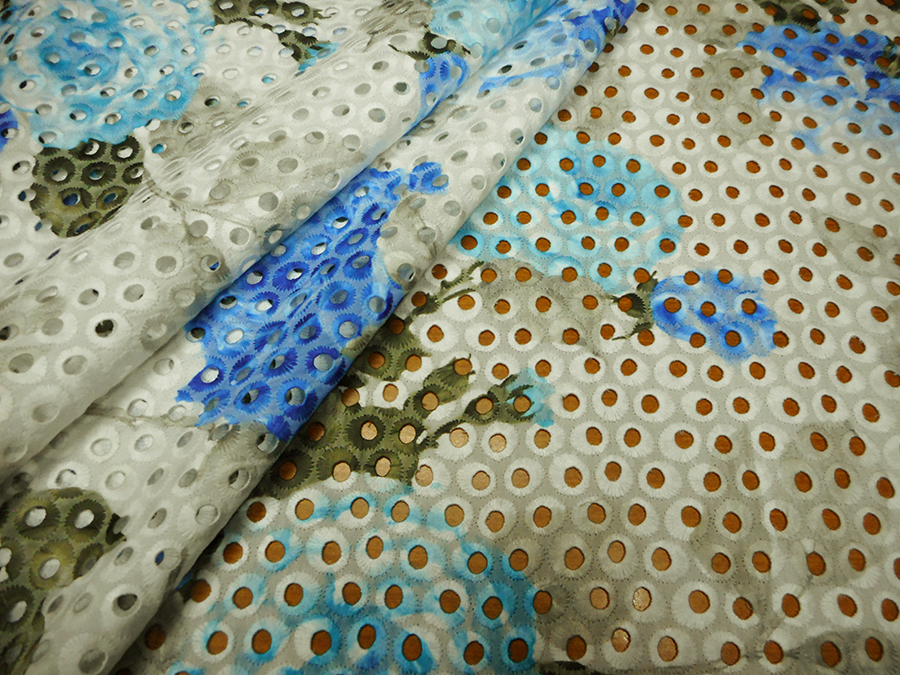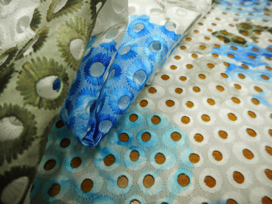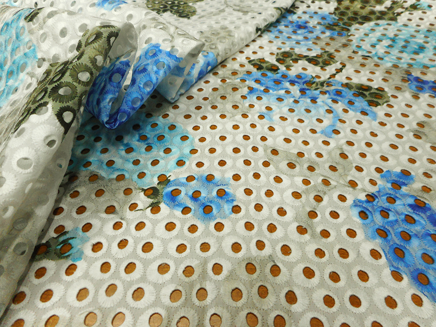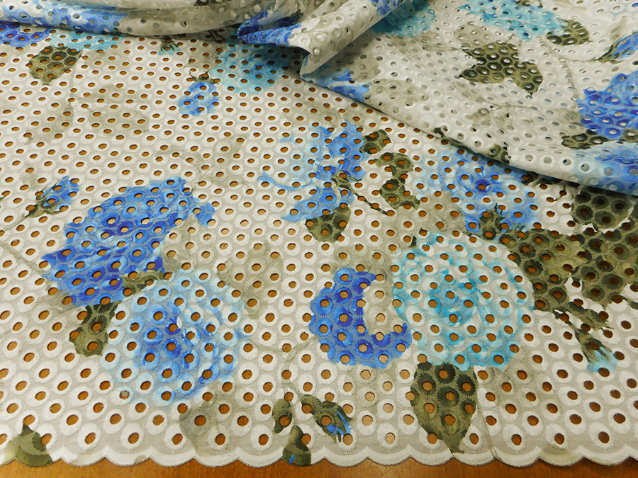 ESCLUSIVO PIZZO SANGALLO IN COTONE, RICAMATO E TRAFORATO, FONDO BIANCO CON FANTASIA SFUMATA SUI TONI DELL’AZZURRO, SABBIA E MUSCHIO.RIFINITO CON 2 FESTONI UGUALI DA AMBO I LATI. INDICATO PER: ABITI, CASACCHE, GONNE, ECC..