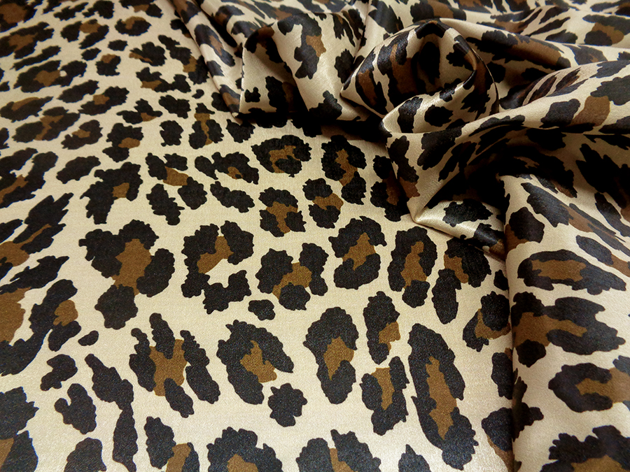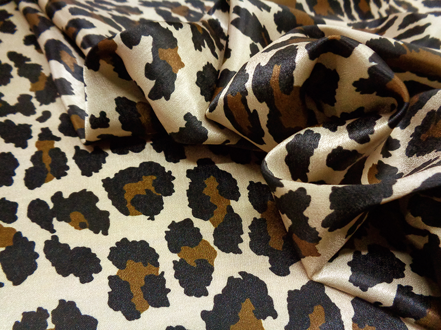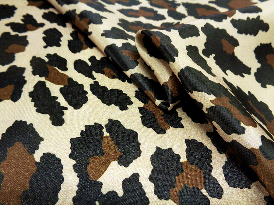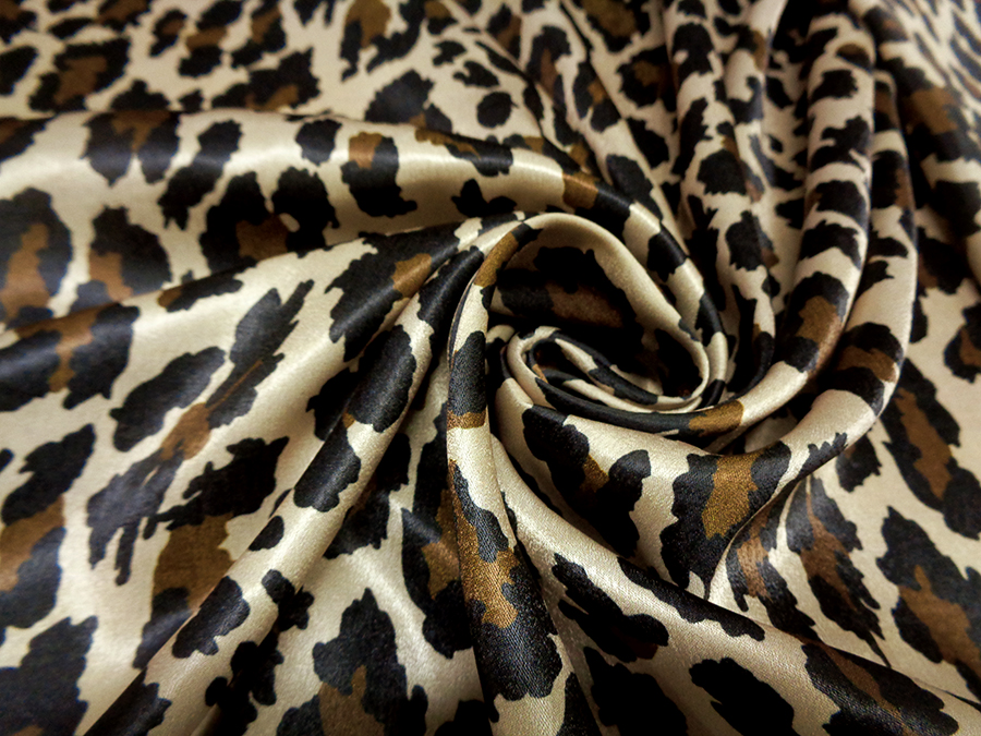 MORBIDO E LUMINOSO SATIN COPRENTE FONDO BEIGE CON STAMPA MACULATA SUI TONI DEL MARRONE E NERO. INDICATO PER: ABITI, CAFTANI, GONNE, CAMICIE,PANTALONI PALAZZO, ECC..