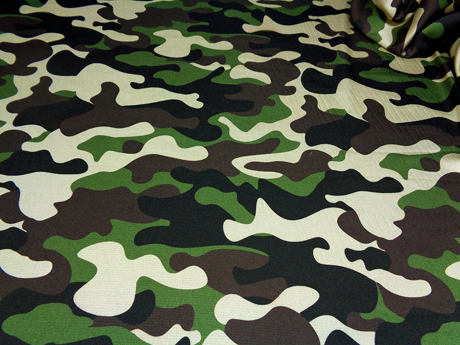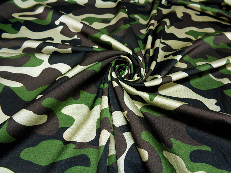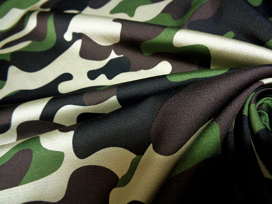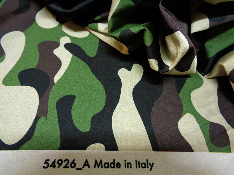 MORBIDO E LUMINOSO SATIN COPRENTE CON STAMPA MIMETICA SUI TONI DEL VERDE, BEIGE, MARRONE E NERO. INDICATO PER: ABITI, CAFTANI, GONNE, CAMICIE, PANTALONI PALAZZO, ECC..