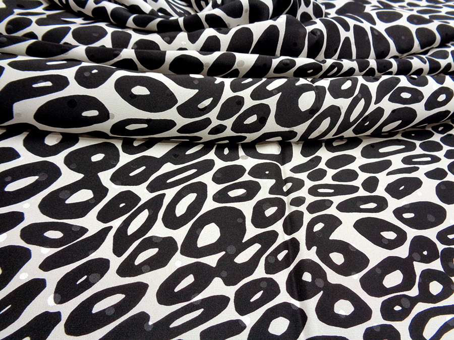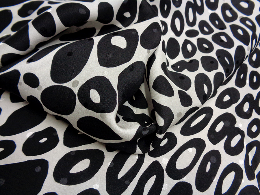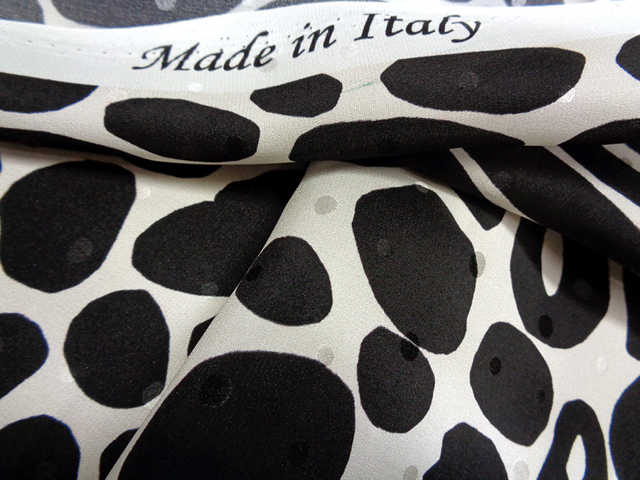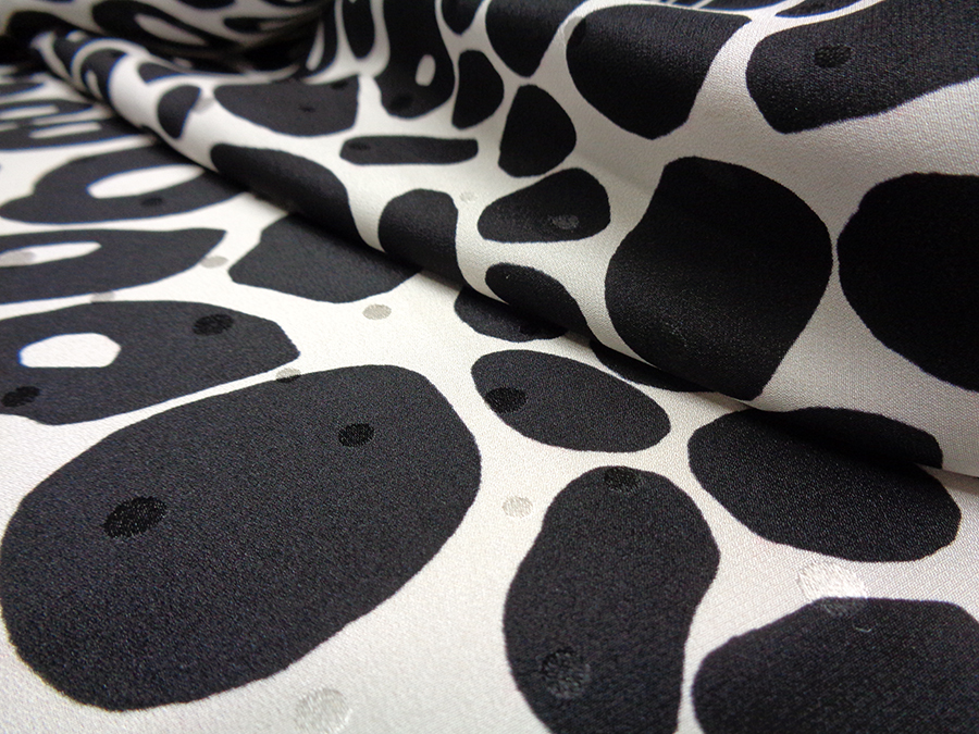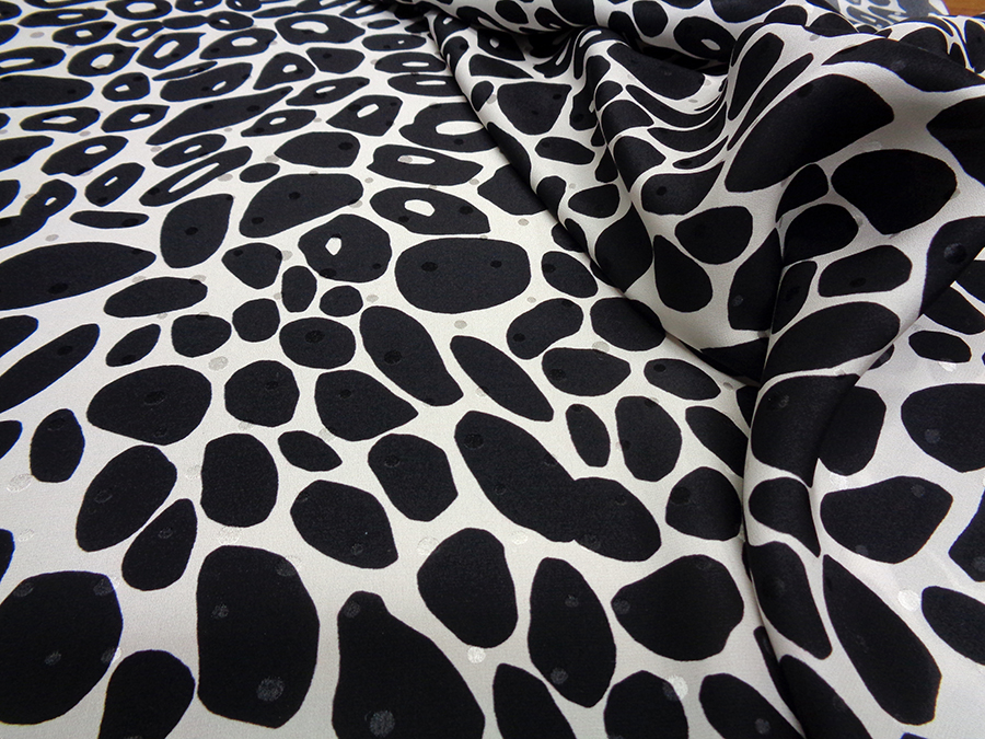 ESCLUSIVA E PREGIATA SETA PURA BASE SATIN STAMPATO DALLA PARTE OPACA, MORBIDA E COPRENTE, FONDO BIANCO CON MACCHIE STILIZZATE NERE. LAVORAZIONE JAQUARD A PICCOLI POIS LUCIDI / OPACHI TINTA SU TINTA. INDICATO PER: BLUSE, ABITI, GONNE, CAMICETTE, INTERNI DI CAPPOTTI E PELLICCE. ECC..