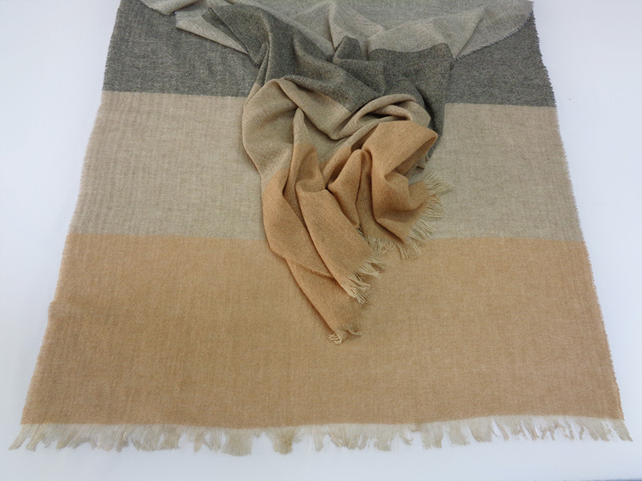 PREGIATISSIMA ED ESCLUSIVA SCIARPA/STOLA IN PURO CASHMERE ULTRASOFT CON PARTICOLARE LAVORAZIONE’ AIRCASH* CHE RENDE LA SCIARPA INCREDIBILMENTE SOFFICE, MORBIDISSIMA  CALDA E LEGGERA. REALIZZATA CON FILATI NATURALI NON TINTEGGIATI IN DEGRADE DAL COLORE MIELE, BEIGE NATURALE, GRIGIO MELANGE, CORDA NATURALE. RIFINITA CON FRANGETTE REALIZZATE A MANO. CAPO UNISEX. LA MISURA LA RENDE PARTICOLARMENTE ADATTA PER ESSERE UTILIZZATA COME CALDA ED AVVOLGENTE SCIARPA O LEGGERA, SOFFICE E CALDA STOLA. LA REALIZZAZIONE ARTIGIANALE A TELAIO CON FILATI IN CASHMERE DI TOP MONGOLIA LAVORATI A GARZA E PRIVI DI TINTEGGIATURA, RENDE IL CAPO INCREDIBILMENTE SOFFICE E MORBIDO,  DONANDO SENSAZIONI UNICHE AL CONTATTO CON LA PELLE: LEGGEREZZA E CALORE INCOMPARABILI.
