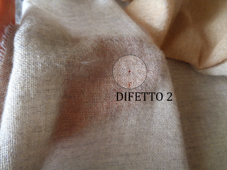 *DIFETTO 2: DUE PICCOLISSIMI ED IMPERCETTIBILI BUCHI IN TRAMA A 15 DALLA CIMOSA LATELARE NELLA META’ DELLA SCIARPA. POSSIBILE REALIZZARE RAMMENDO O LASCIARE L’INVISIBILE IMPERFEZIONE (VEDI FOTO). IDEALE PER USO PERSONALE.