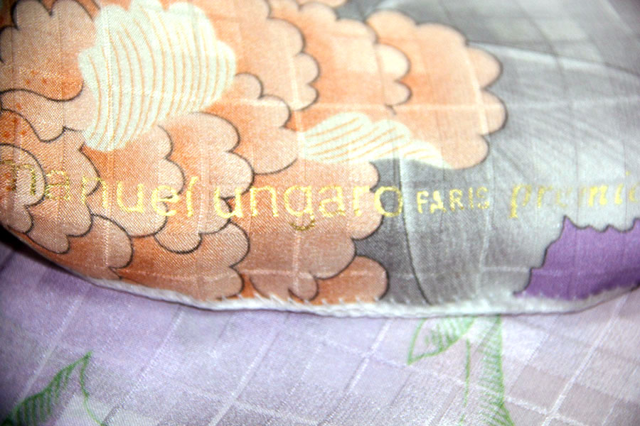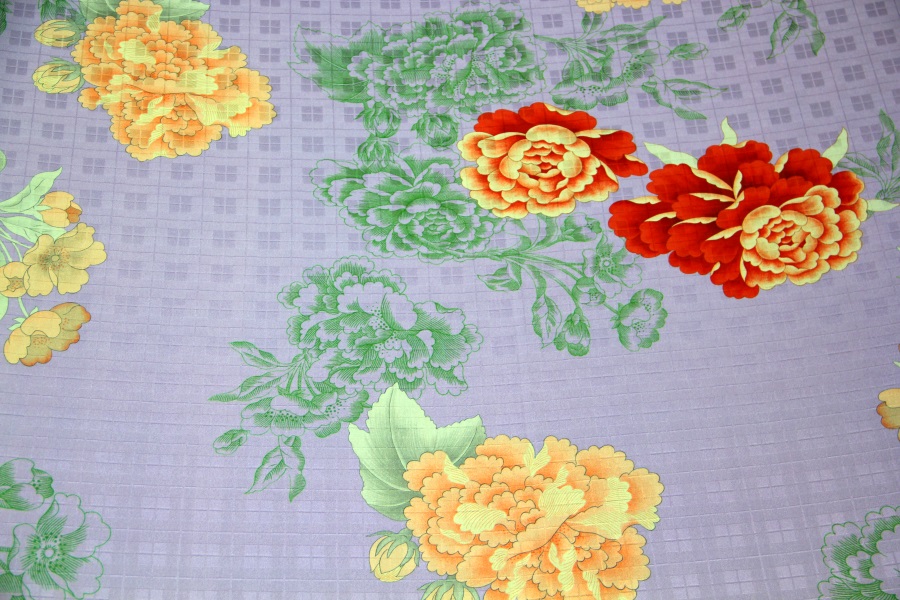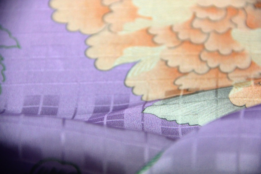 ESCLUSIVA SETA DELLA COLLEZIONE UNGARO PREMIERE PARIS, FONDO LILLA CON LAVORAZIONE QUADRETTATA LUCIDA E OPACA E FANTASIA CON FIORI SUI TONI DEL SALMONE, E  ARAGOSTA . INDICATA PER : ABITO, GONNE, CASACCA,PANTALONI , PIGIAMA PALAZZO, ECC..