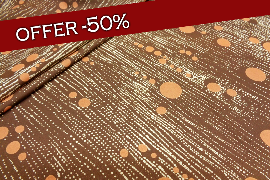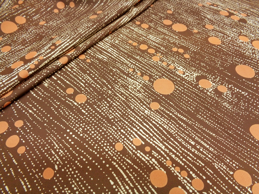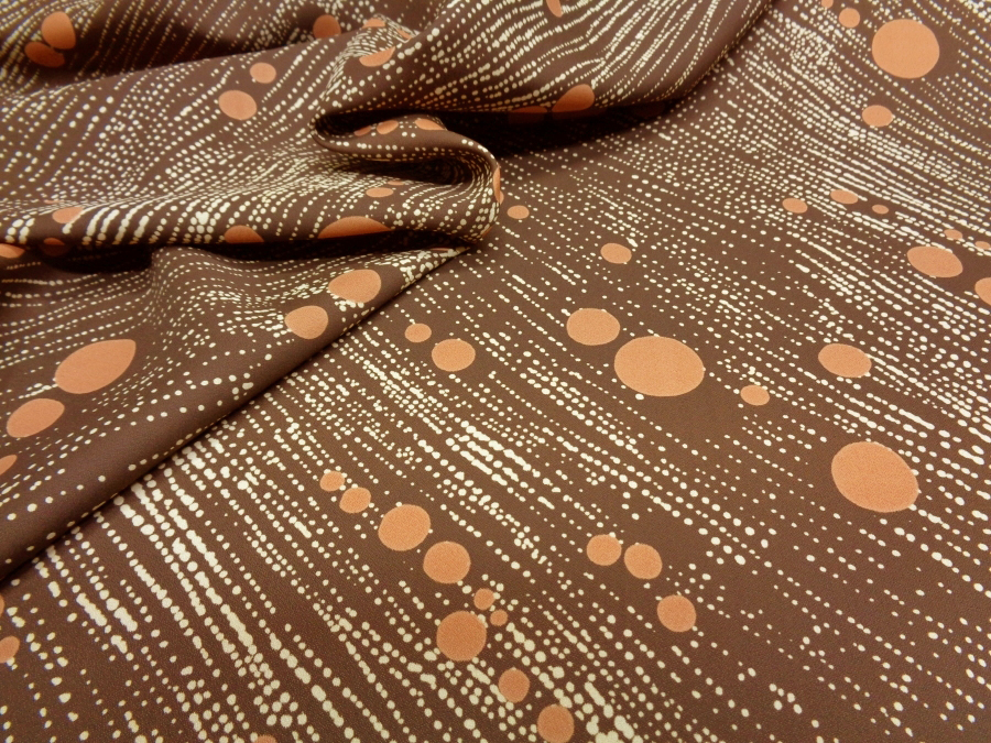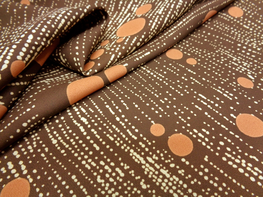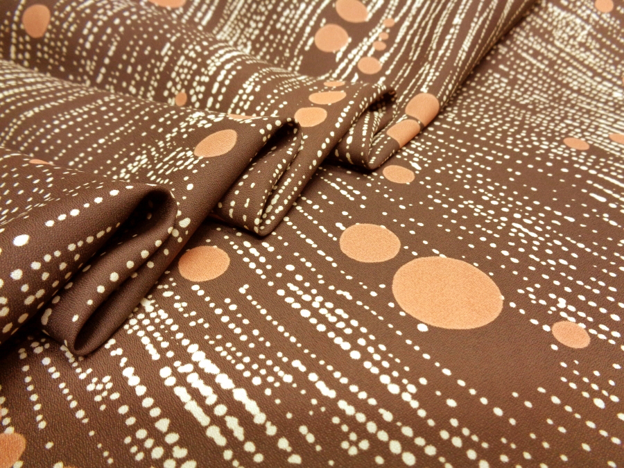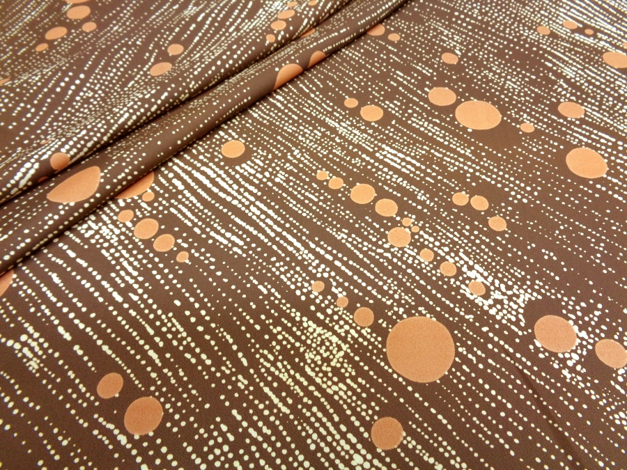 AUTENTICO VINTAGE ANNI ’70. TESSUTO SETIFICATO EFFETTO CREPE DE CHINE OPACO E COPRENTE, FONDO MARRONE CON DISEGNI GEOMETRICI SUI TONI DEL NOCCIOLA E AVORIO. INDICATA PER: ABBIGLIAMENTO, ECC..