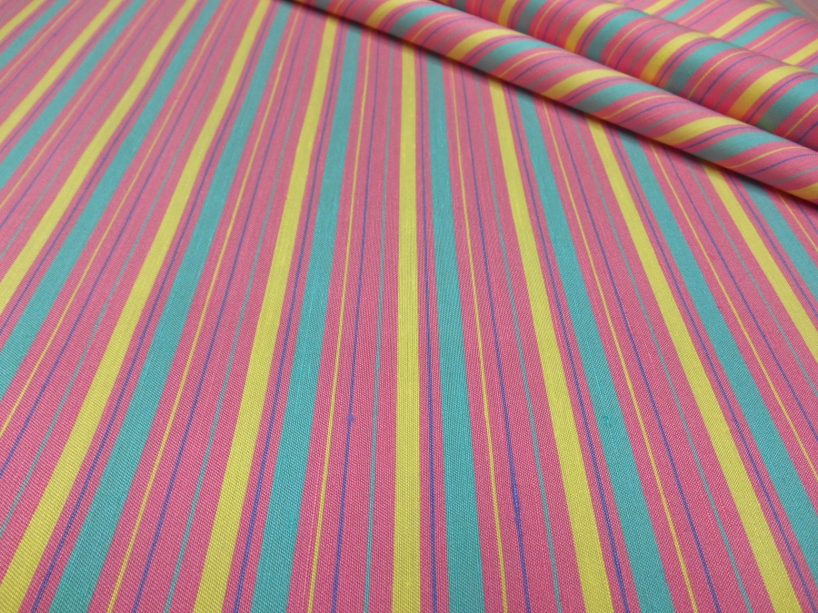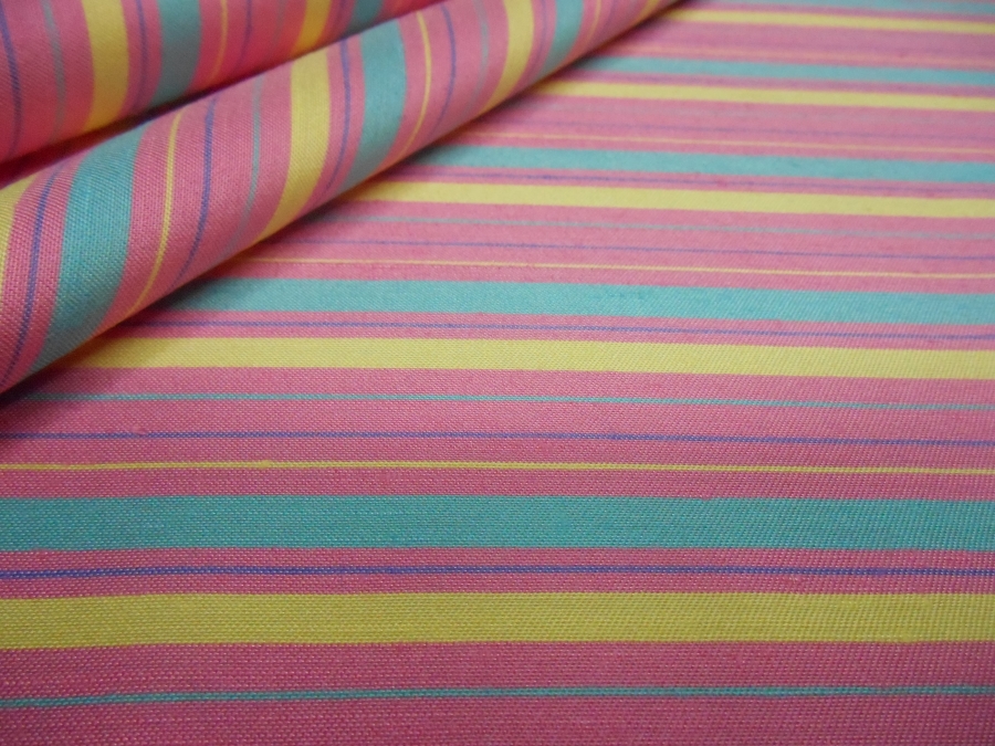 SHANTUNG ART ELISA V. ROSA H: 150 € 25,00 AL MT. 30 %SETA, 70% VISCOSA FONDO ROSA CON RIGHE COLORATE: GIALLE, E AZZURRE. INDICATO PER: ABITI, GIACCHE, GONNE, PANTALONI, ECC