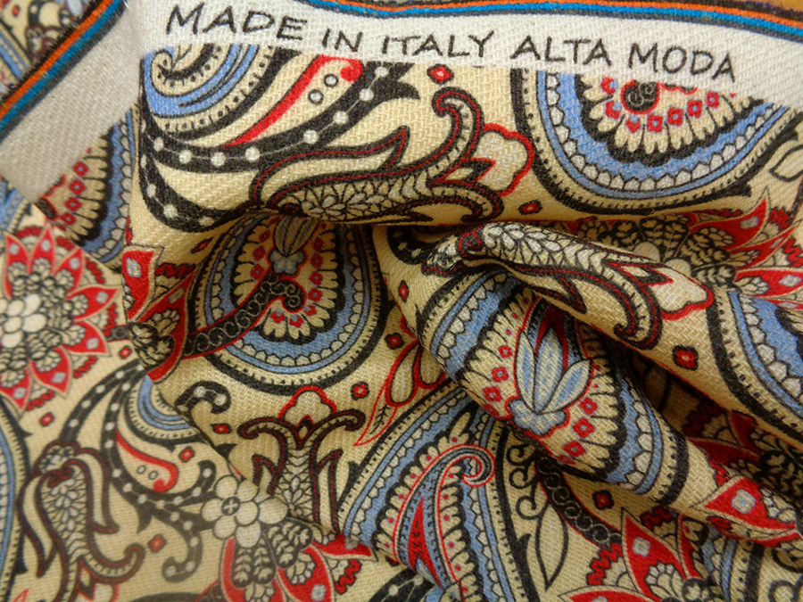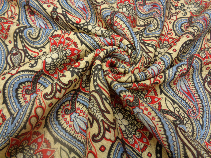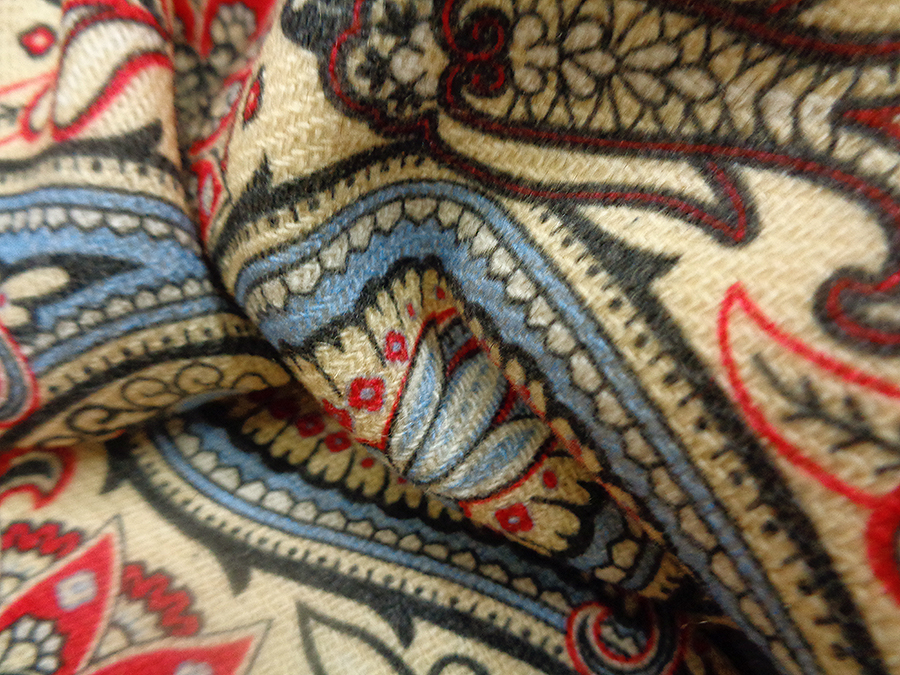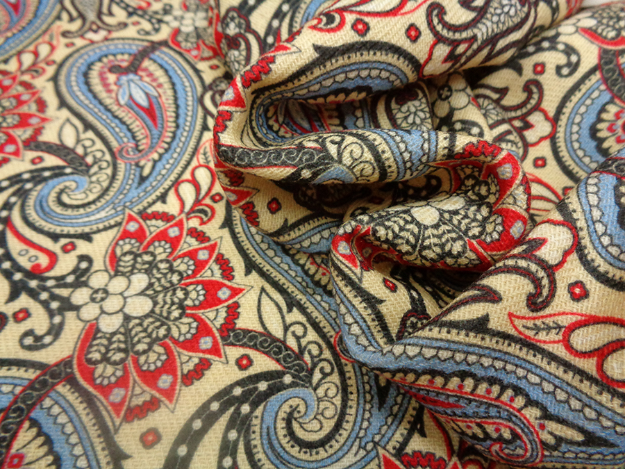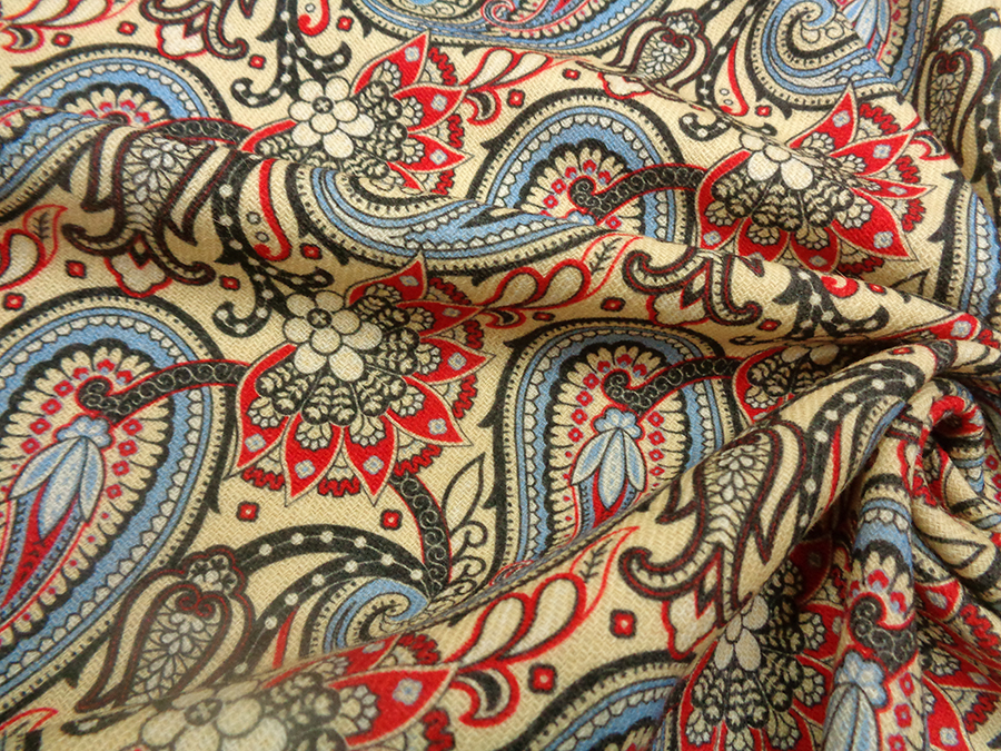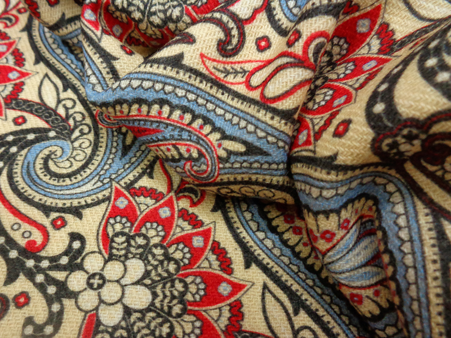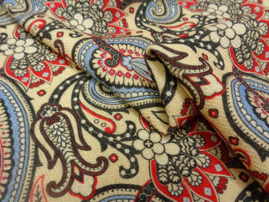 PREGIATO ED ESCLUSIVO TESSUTO IN SHETLAND DI PURA LANA STAMPATO. PESO MEDIO, CALDO ED OPACO CON CARATTERISTICA TRAMA SHETLAND (DIAGONALE). FONDO BEIGE CHIARO CON DISEGNI CASHMERE SUI TONI DEL ROSSO, AZZURRO, BORDEAUX E NERO. TESSUTO UNISEX INDICATO PER: GIACCONI, CAPPOTTI, CARDIGAN, GIACCHE, MANTELLE, KIMONO, VESTAGLIE, PLAID, ECC..