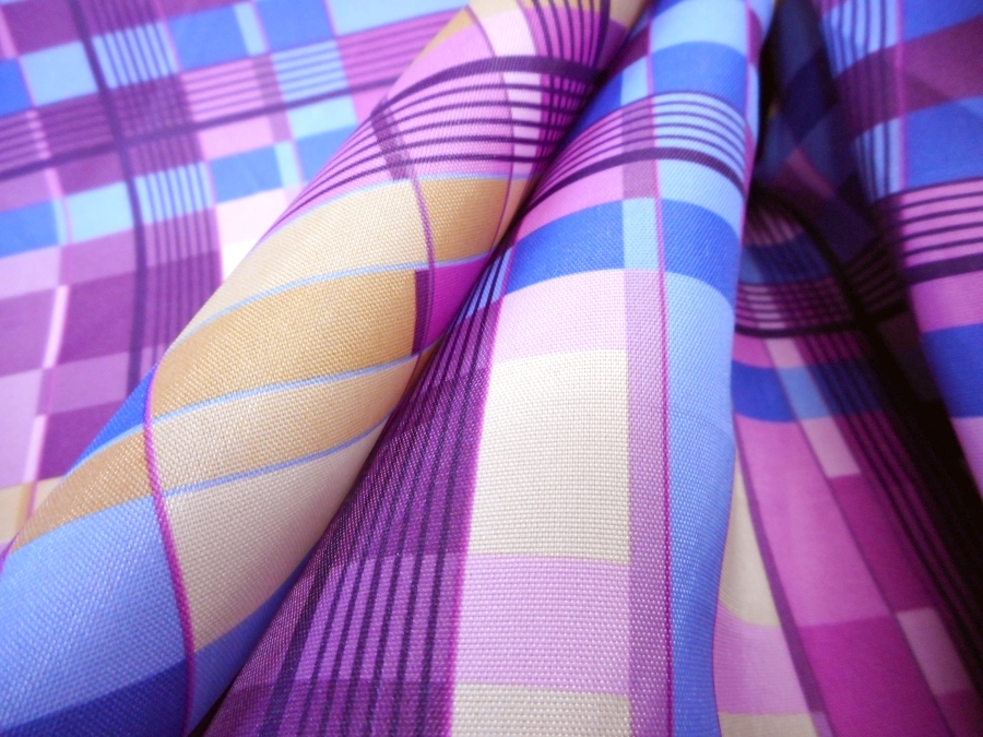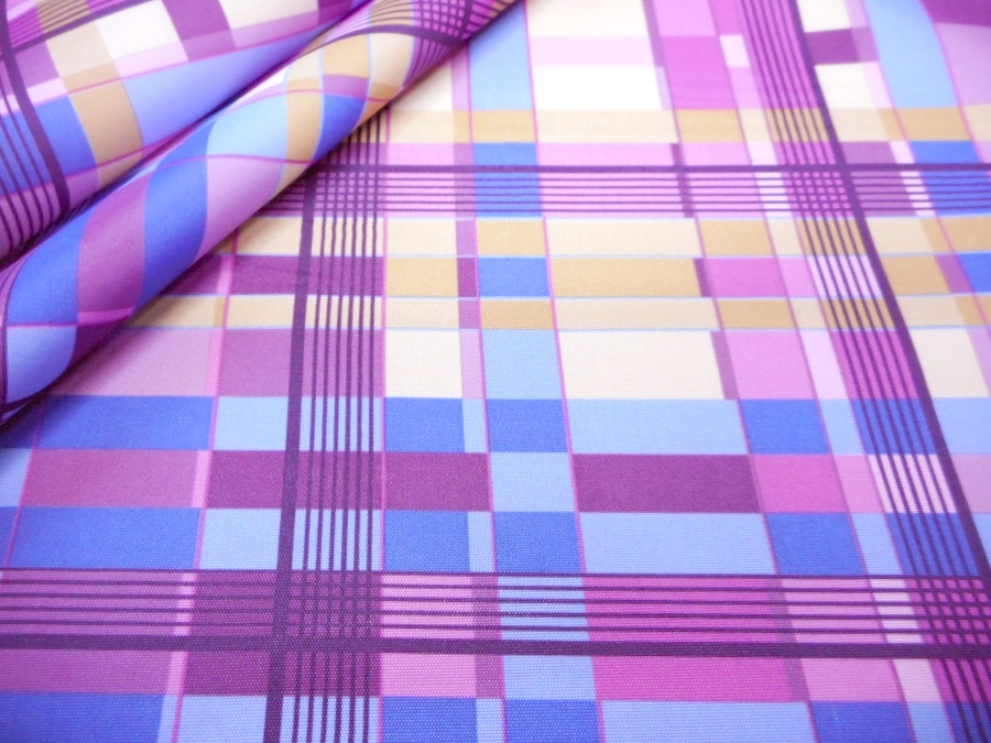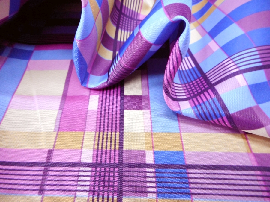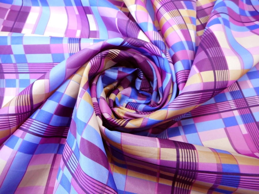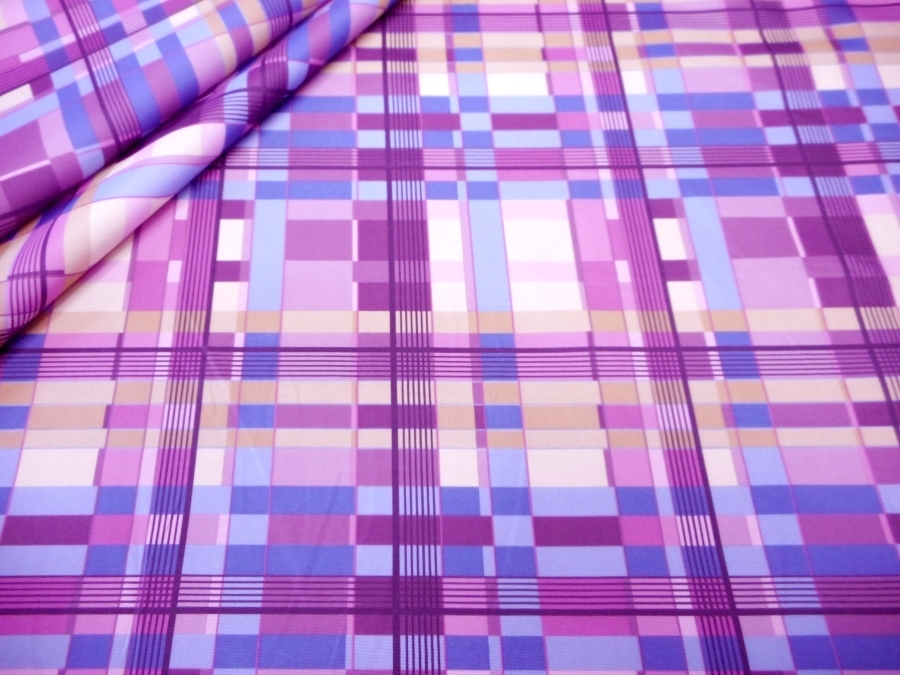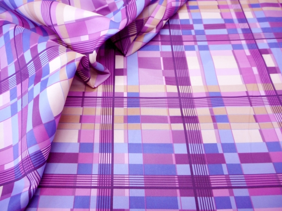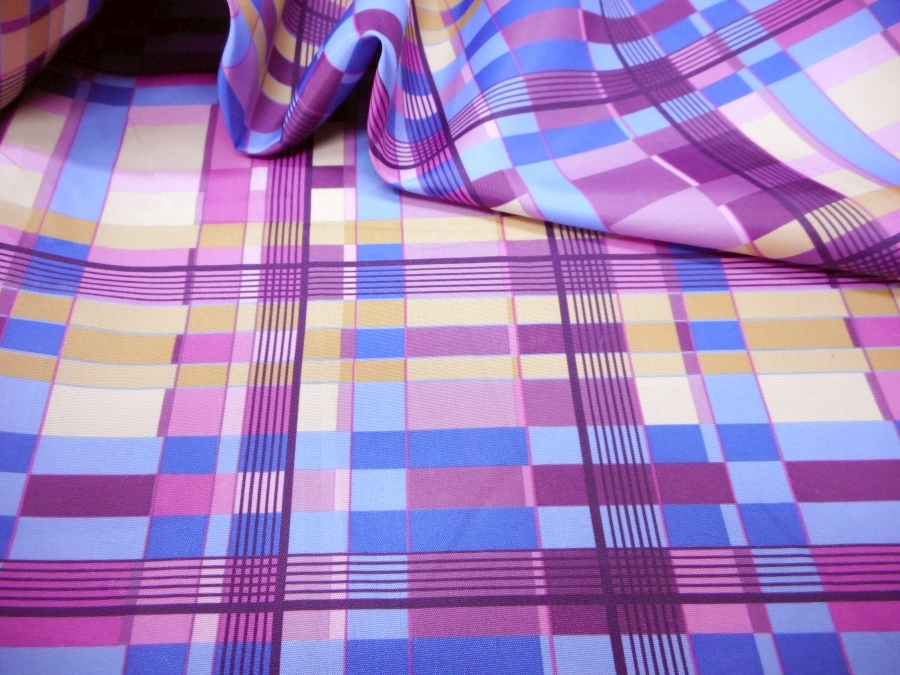 TESSUTO TIPO TAFFETA’ CON MANO PIU’ MORBIDA E LEGGERA RISPETTO AD UN CLASSICO TAFFETA’. FANTASIA ASTRATTA A RIQUADRI SUI TONI DELL’AZZURRO, CICLAMINO E BEIGE. INDICATO PER: ABITI, GONNE VAPOROSE, ECC..