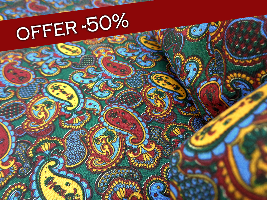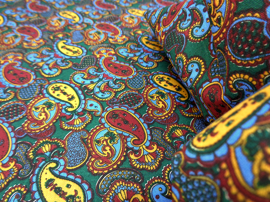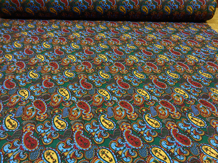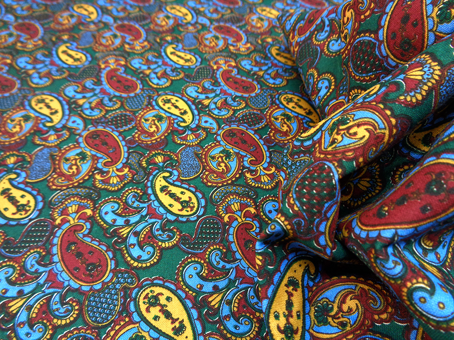CLASSICA TELA IN PURO COTONE, PESO MEDIO, CONSISTENTE E LEGGERMENTE RIGIDA. FONDO VERDE BOTTIGLIA CON DISEGNI CASHMERE SUI TONI DEL BORDEAUX, OCRA E AZZURRO. INDICATO PER: ABBIGLIAMENTO, ARREDAMENTO, BRICOLAGE, ECC..