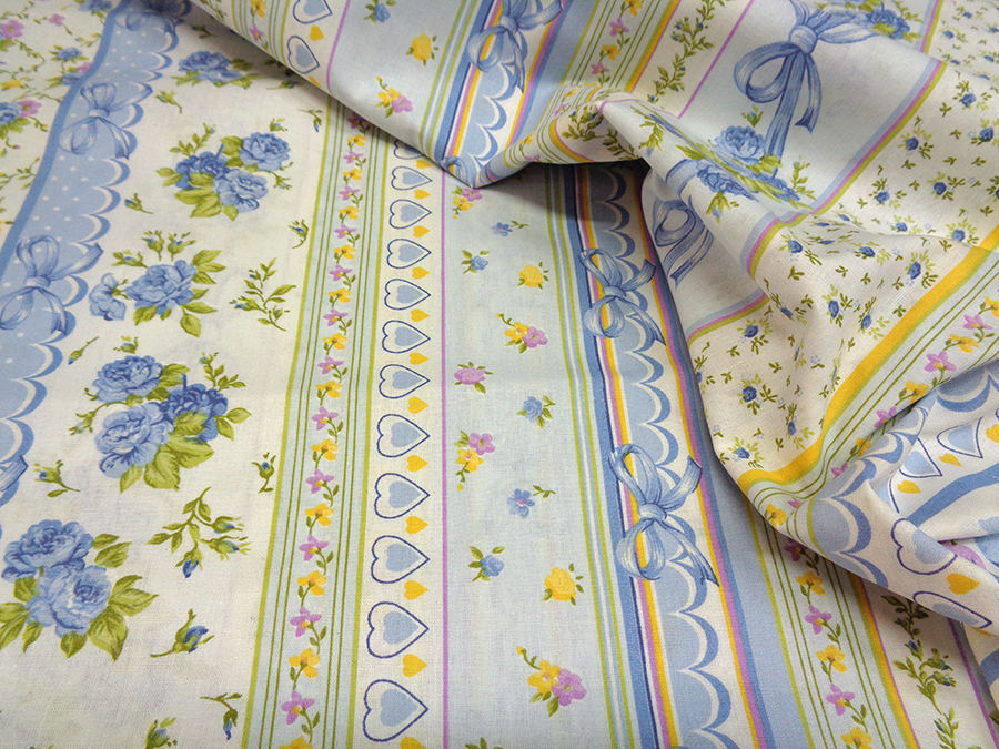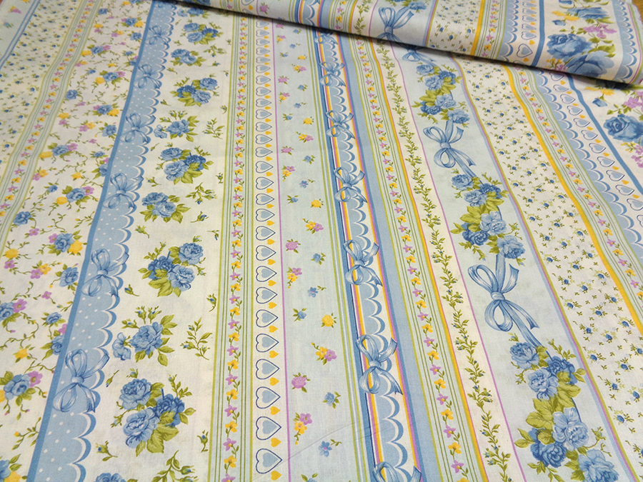 CLASSICA TELA IN PURO COTONE, PESO MEDIO, FONDO BIANCO CON FANTASIA SUI TONI DELL’AZZURRO, ROSA, GIALLO. INDICATO PER: ABBIGLIAMENTO, ARREDAMENTO, BRICOLAGE, BIMBI, ECC..