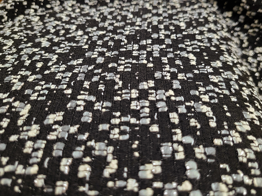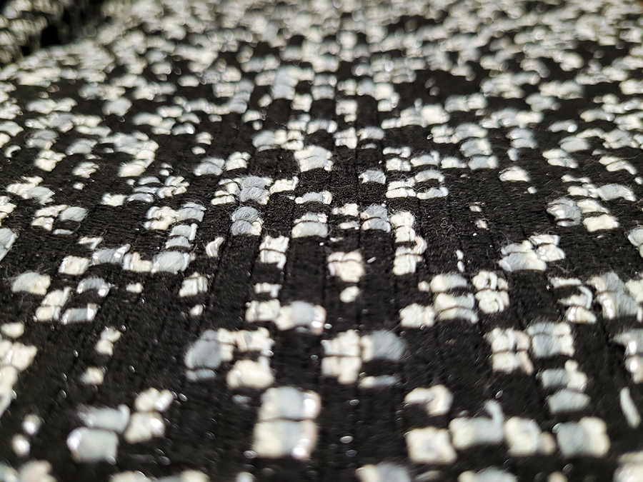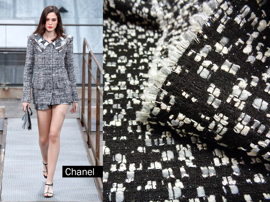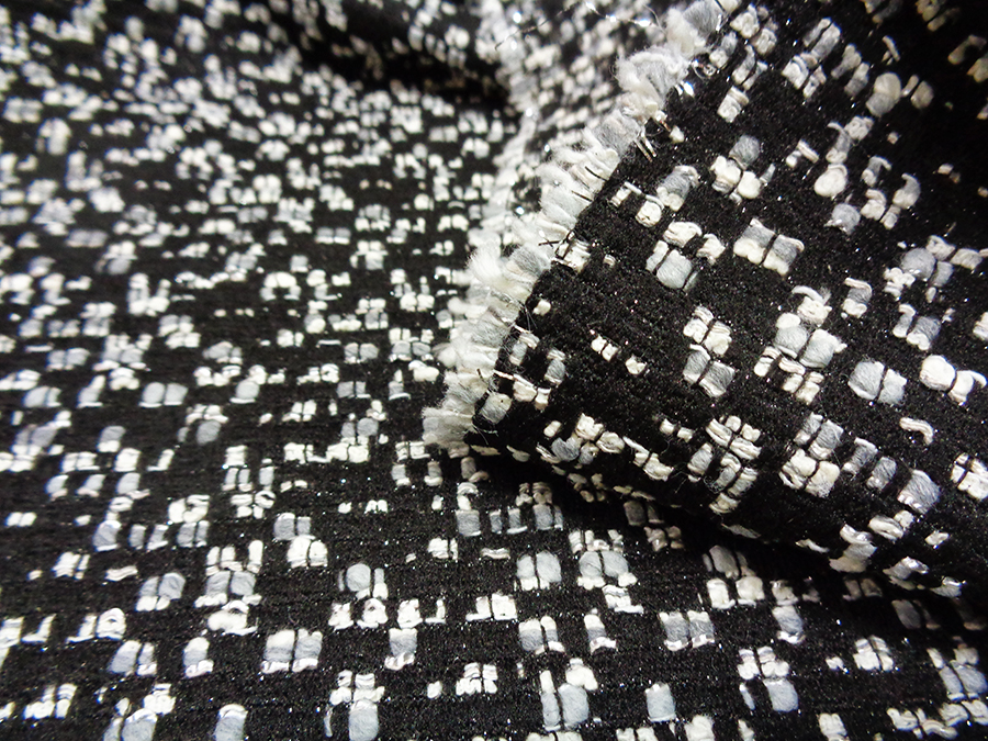 CHANEL STOCK (NO FIRMATO, NO CORREDATO DA ETICHETTE) PREGIATO ED ESCLUSIVO TESSUTO CHANEL, FONDO NERO CON PARTICOLARE LAVORAZIONE AD INTRECCIO SUI TONI DEL GRIGIO MEDIO E GRIGIO PERLA, CON IMPERCETTIBILI BAGLIORI OTTENUTI DA FILI IN LUREX IN TRAMA COLORE NERO E ARGENTO. INDICATO PER: GIACCHE, TAILLEUR, GONNE, ABITI, SOPRABITI, ECC