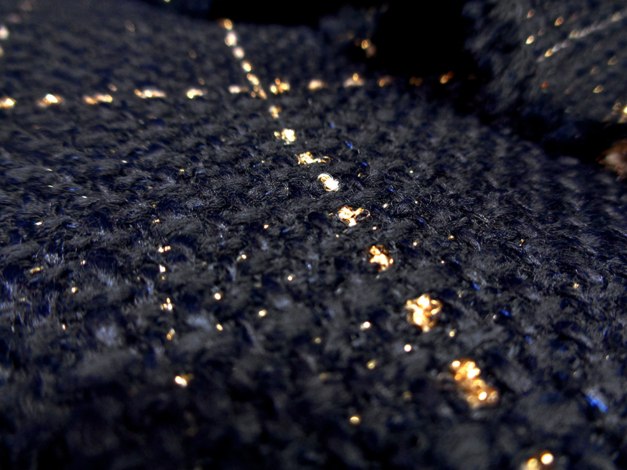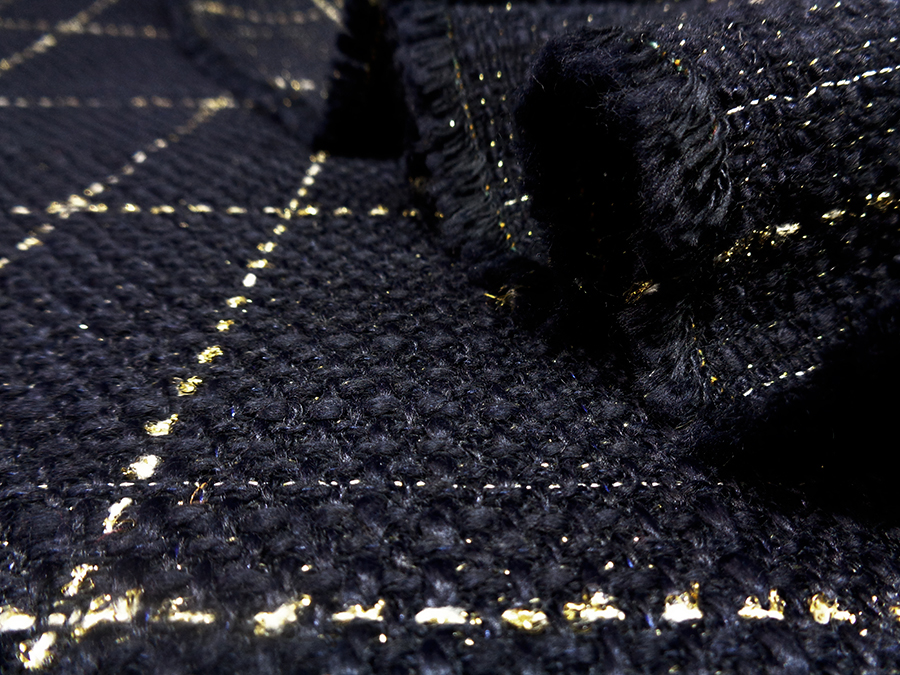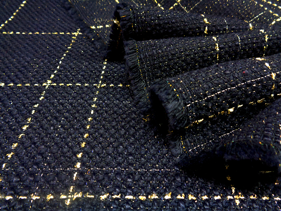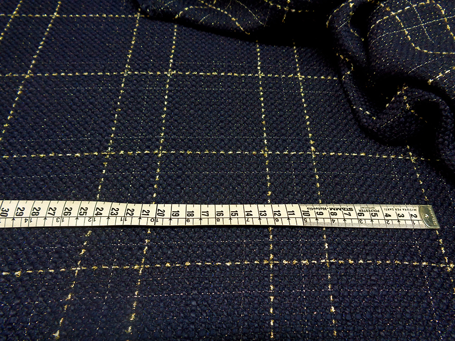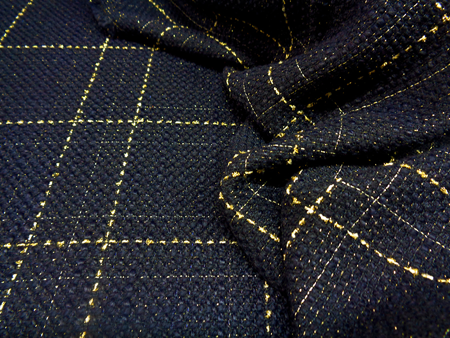 PREGIATO ED ESCLUSIVO TESSUTO TWEED TRAMA CHANEL, MORBIDO E CORPOSO, FONDO BLU CON PARTICOLARE LAVORAZIONE AD INTRECCIO TINTA SU TINTA, IMPERCETTIBILI BAGLIORI DORATI IN TRAMA E RIQUADRI IN FILATO LUREX ORO. INDICATO PER: GIACCHE, TAILLEUR, GONNE, ABITI.