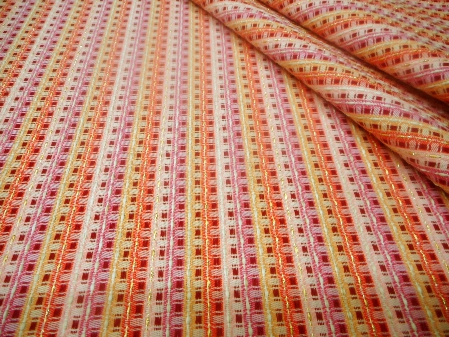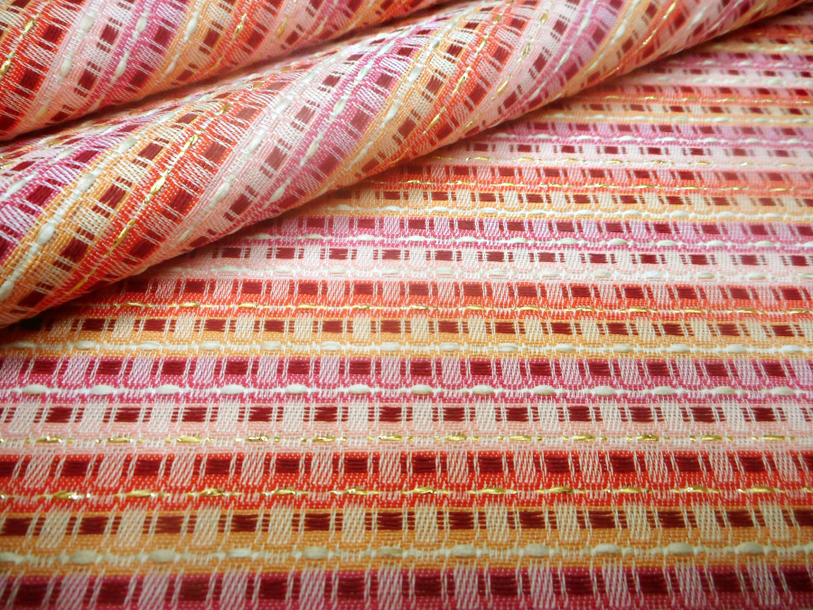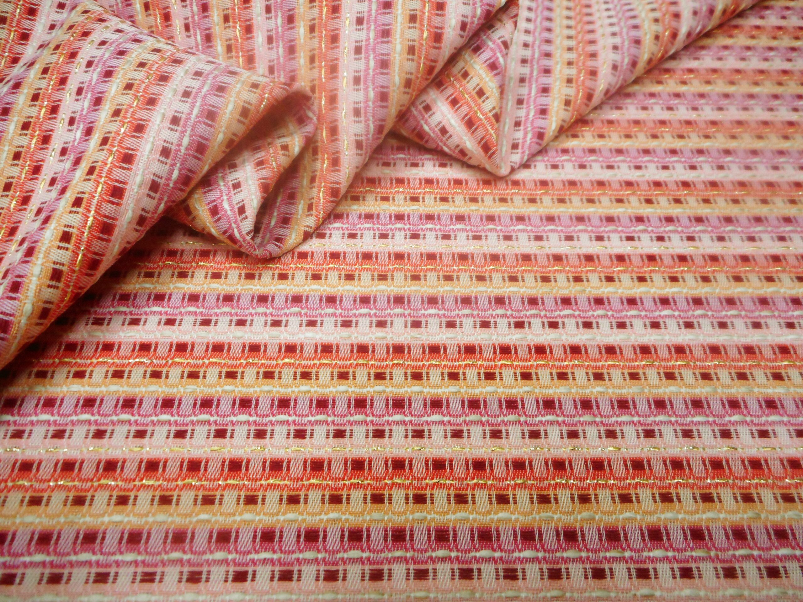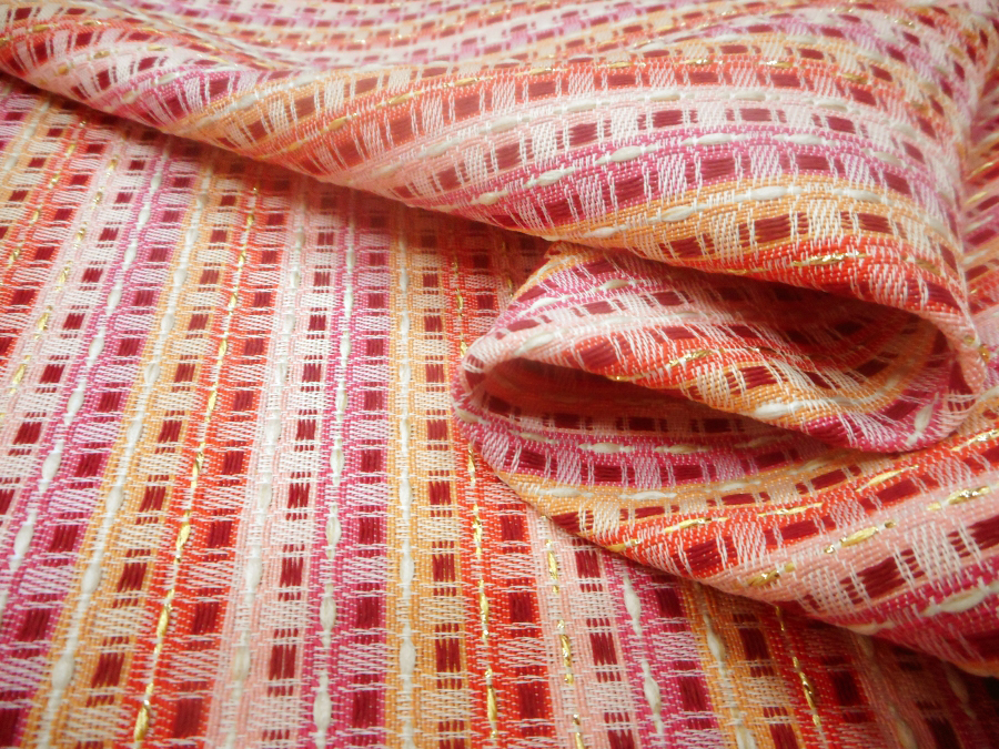 PREGIATO TESSUTO IN COTONE CON TRAMA COMPATTA EFFETTO CHANEL , SULLE TONALITA’ DEL CORALLO E ROSA E VINACCIO, CON IMPERCETTIBILE FILO LUREX COLORE ORO ECC. INDICATO PER: TAILLEUR, GIACCHE, GONNE, ABITI, ECC