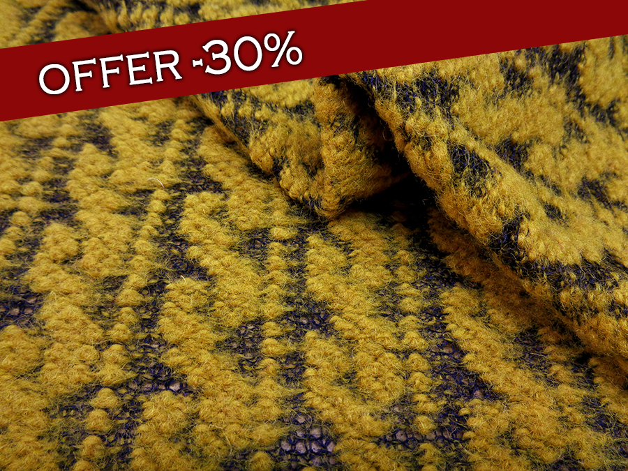 PARTICOLARE TESSUTO TRICOT CON LAVORAZIONE A MAGLIA, PESO MEDIO E MORBIDO. PARTICOLARE TRAMA A RETE NERA E LAVORAZIONE IN RILIEVO IN LANA COLORE OCRA. TESSUTO UNISEX INDICATO PER: GIACCONI, CAPPOTTI, CARDIGAN, COPERTE, PLAIDS, CAPPELLI, ECC..