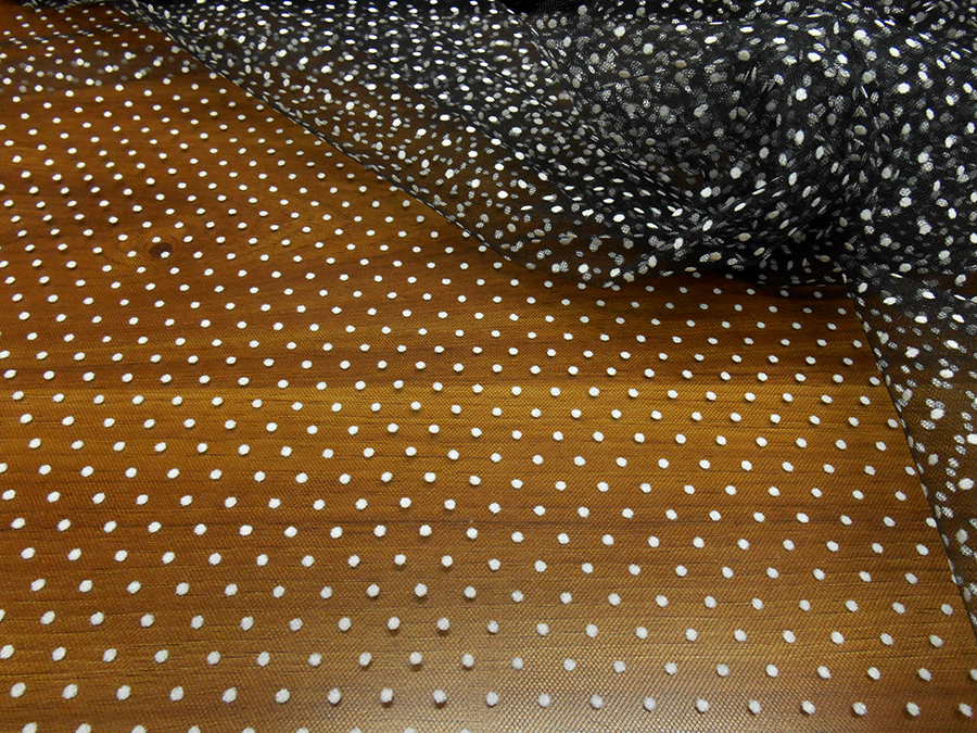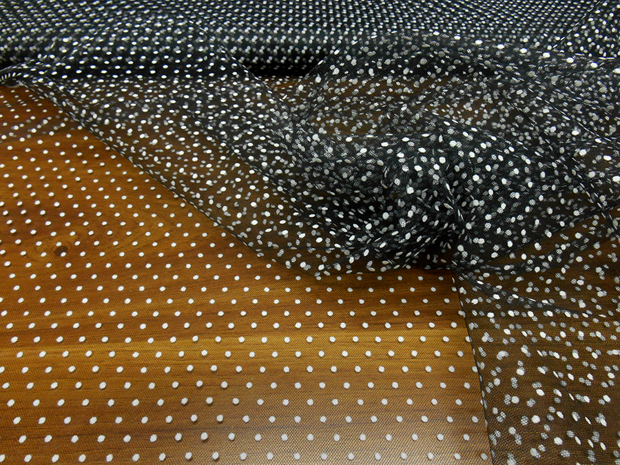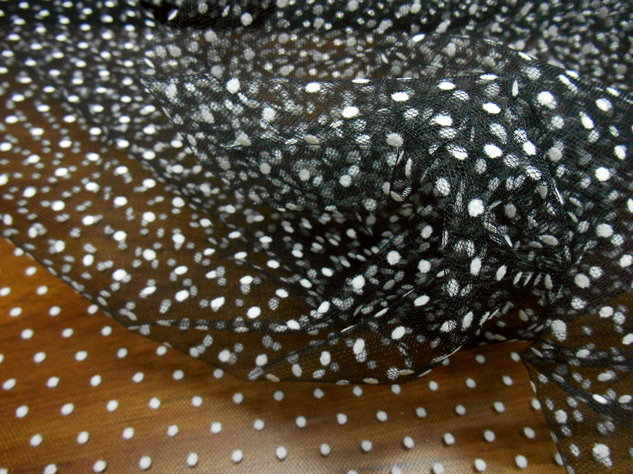 CLASSICO TULLE LEGGERO (TIPO BOMBONIERA) FONDO NERO CON PICCOLI POIS BIANCHI FLOCCATI IN RILIEVO.