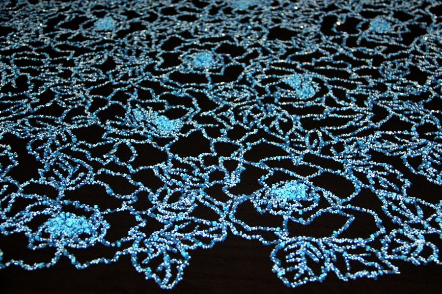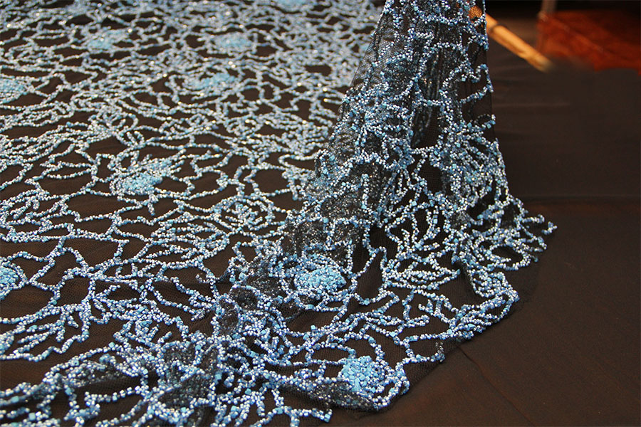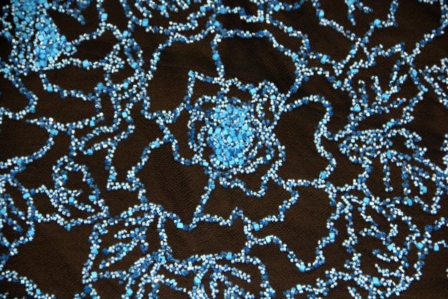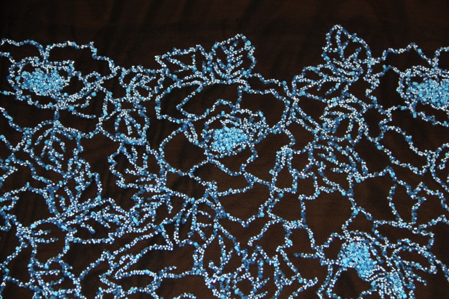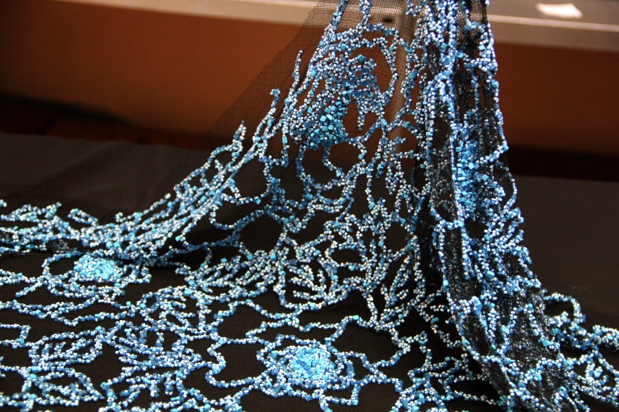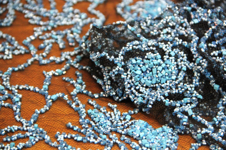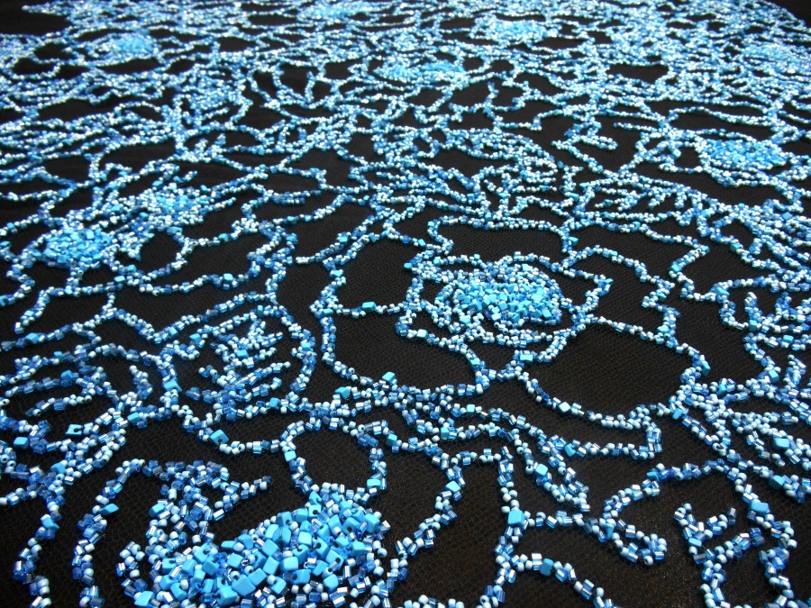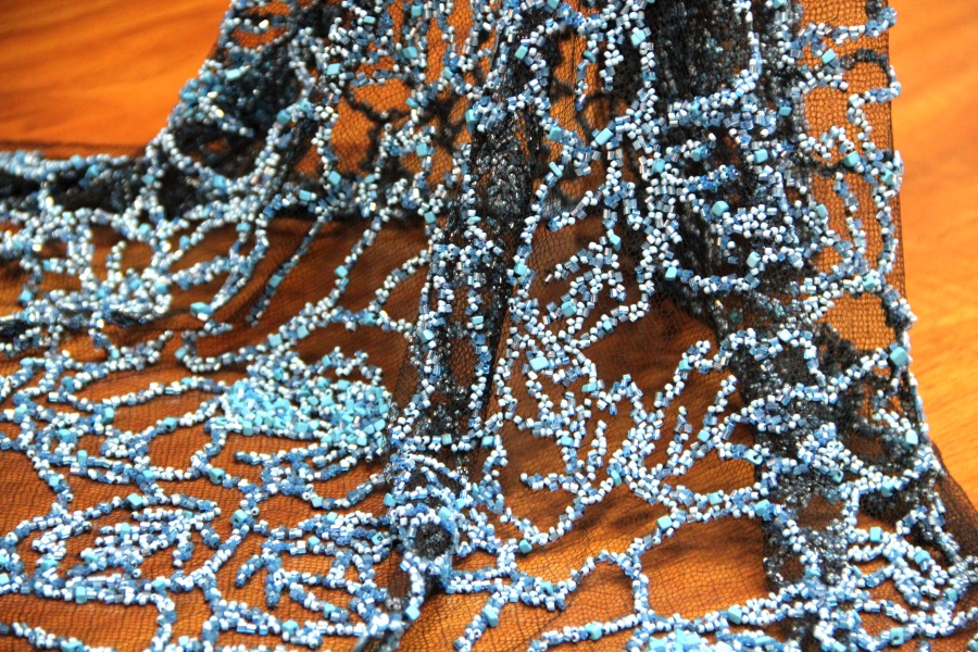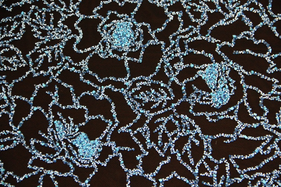 ESCLUSIVO TULLE IN SETA PURA RICAMATO A MANO CON PIETRE DURE E TUBICINI IN VETRO. BASE TULLE NERO EFFETTO RETINA CON RICAMI A FORMARE UN DISEGNO A FIORI STILIZZATI, EFFETTO RAMI DI CORALLO. MATERIALI DI RICAMO ESCLUSIVI E PREZIOSI, CON ALTERNARSI DI PIETRE DURE AD EFFETTO LUMINOSO ED OPACO. POSSIBILITA’ DI UTILIZZO PER APPLICAZIONI, INTARSI, CASACCHE, TOP, ECC. ACQUISTO MINIMO CM 30.