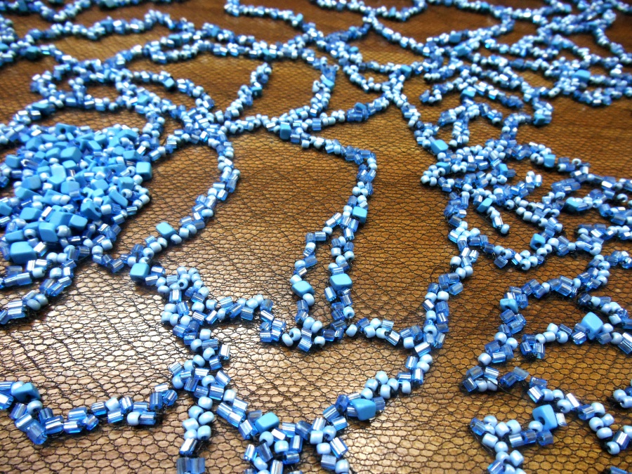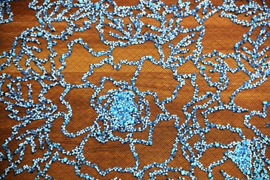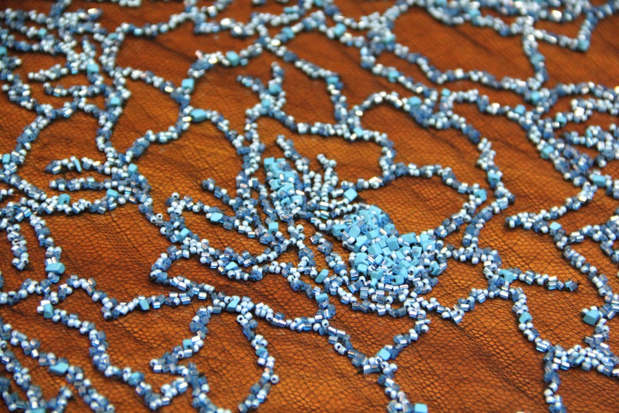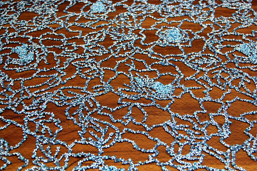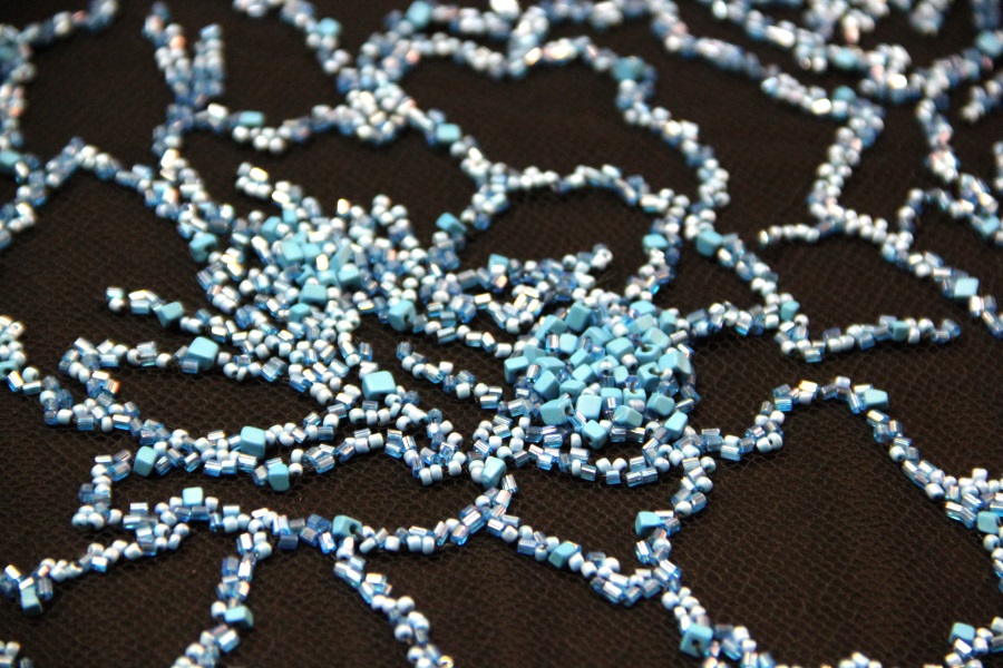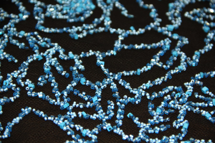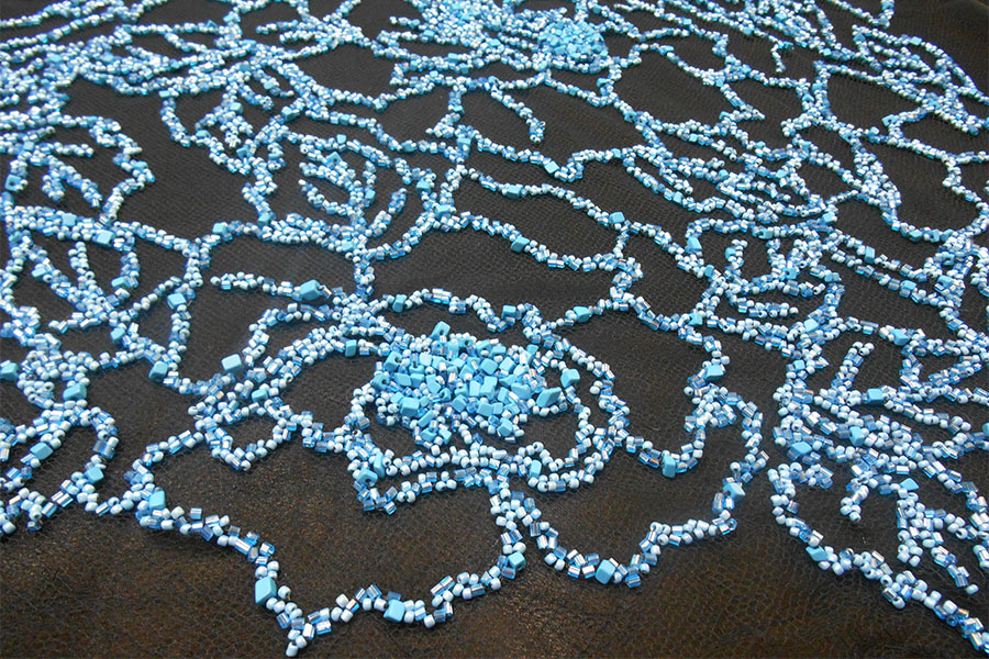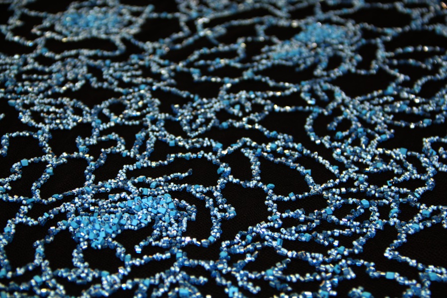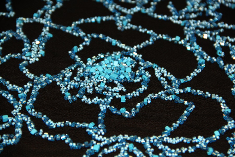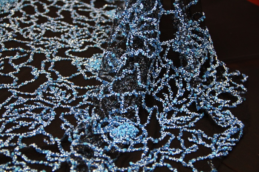 ESCLUSIVO TULLE IN SETA PURA RICAMATO A MANO CON PIETRE DURE E TUBICINI IN VETRO. BASE TULLE NERO EFFETTO RETINA CON RICAMI A FORMARE UN DISEGNO A FIORI STILIZZATI, EFFETTO RAMI DI CORALLO. MATERIALI DI RICAMO ESCLUSIVI E PREZIOSI, CON ALTERNARSI DI PIETRE DURE AD EFFETTO LUMINOSO ED OPACO. POSSIBILITA’ DI UTILIZZO PER APPLICAZIONI, INTARSI, CASACCHE, TOP, ECC. ACQUISTO MINIMO CM 30.