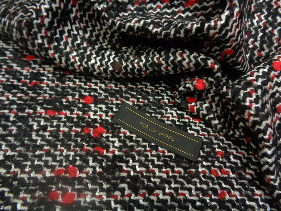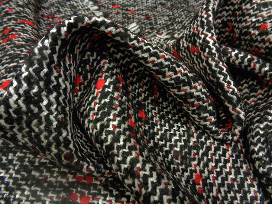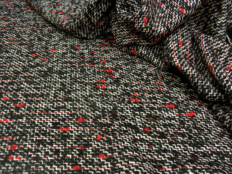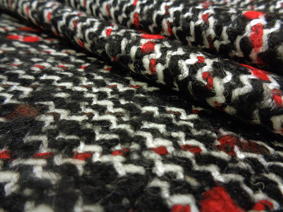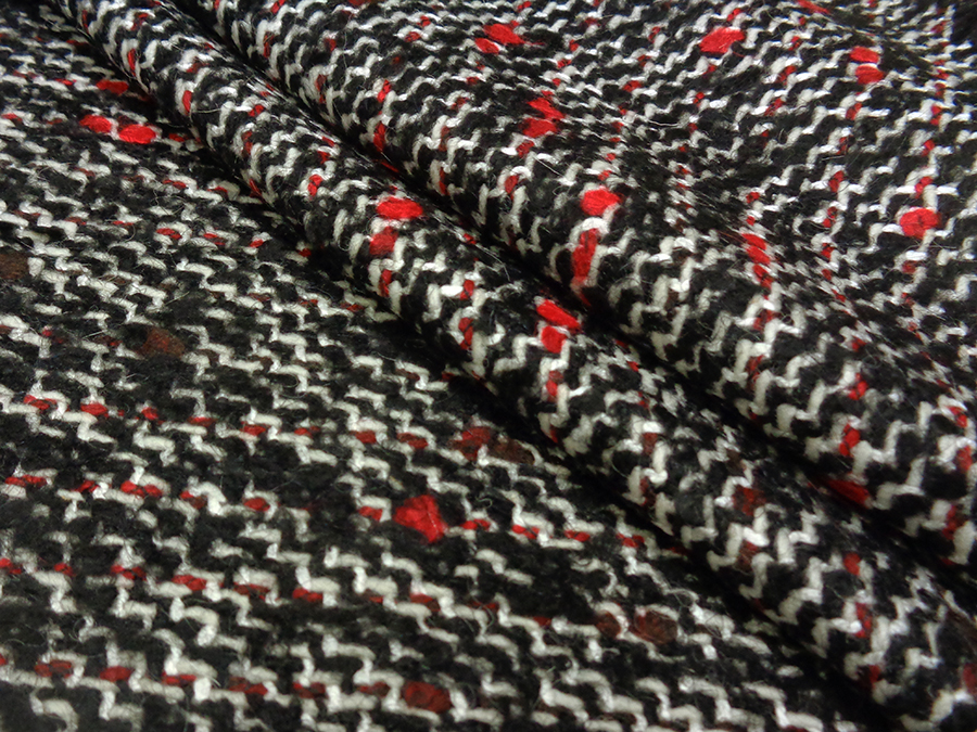 TESSUTO IN LANA CON PARTICOLARE LAVORAZIONE TWEED, CORPOSO, COMPATTO E RASATO. TESSUTO UNISEX SUI TONI DEL NERO, BIANCO E ROSSO. INDICATO PER: CAPPOTTI, GIACCONI, MONTGOMERY, GIACCHE PESANTI, TAILLEUR, MANTELLE, PLAID, ECC..