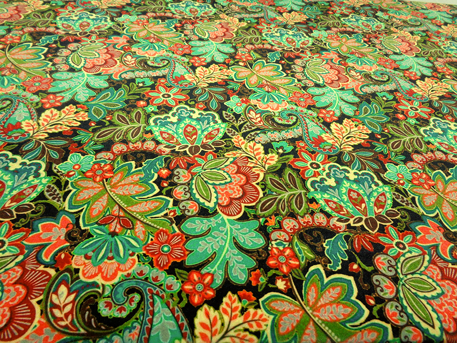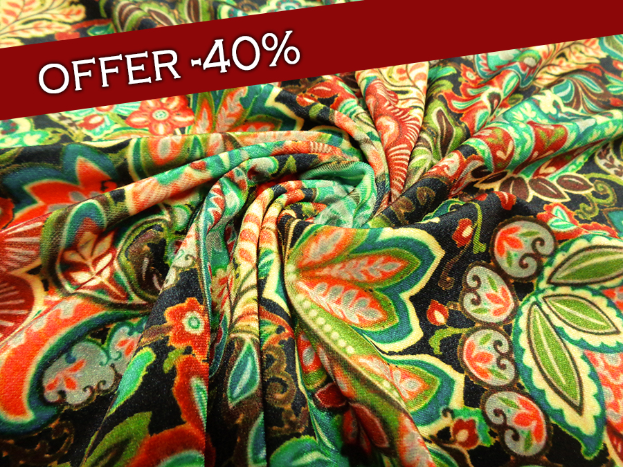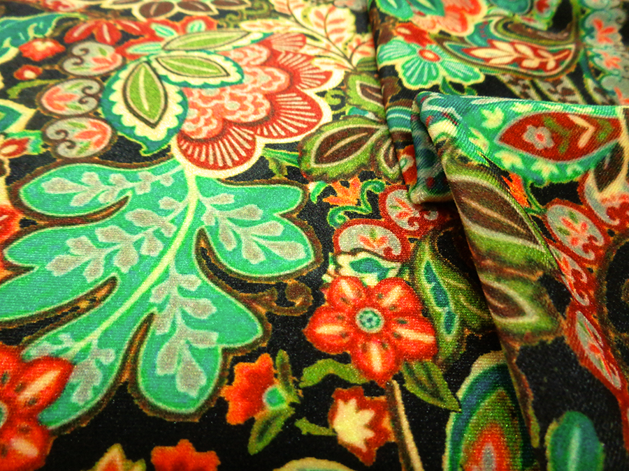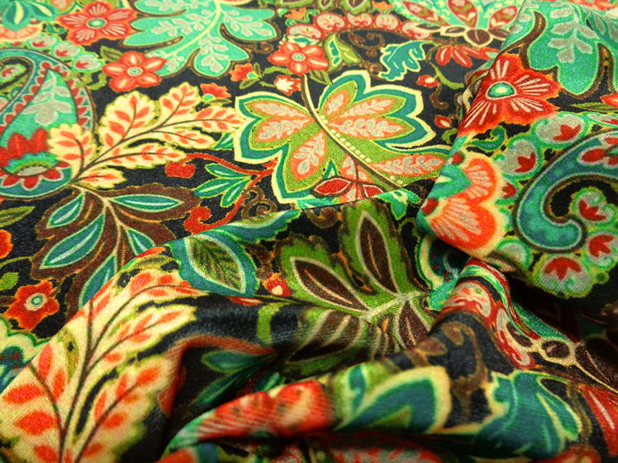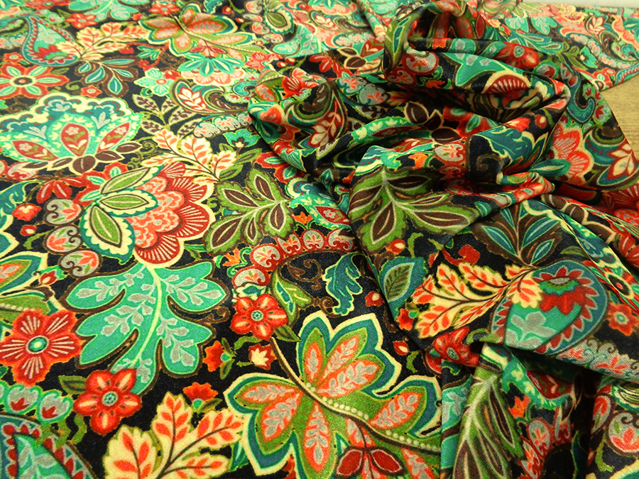ESCLUSIVO VELLUTO LISCIO BIELASTICIZZATO, MORBIDISSIMO, CONSISTENTE, LUMINOSO E CONFORTEVOLE. FONDO NERO CON FANTASIA PAISLEY SUI TONI DEL ROSSO, VERDE GIALLO ARANCIO. INDICATO PER: ABITI, TUNICHE, PANTALONI, TUTE, GONNE, BLUSE, ECC..