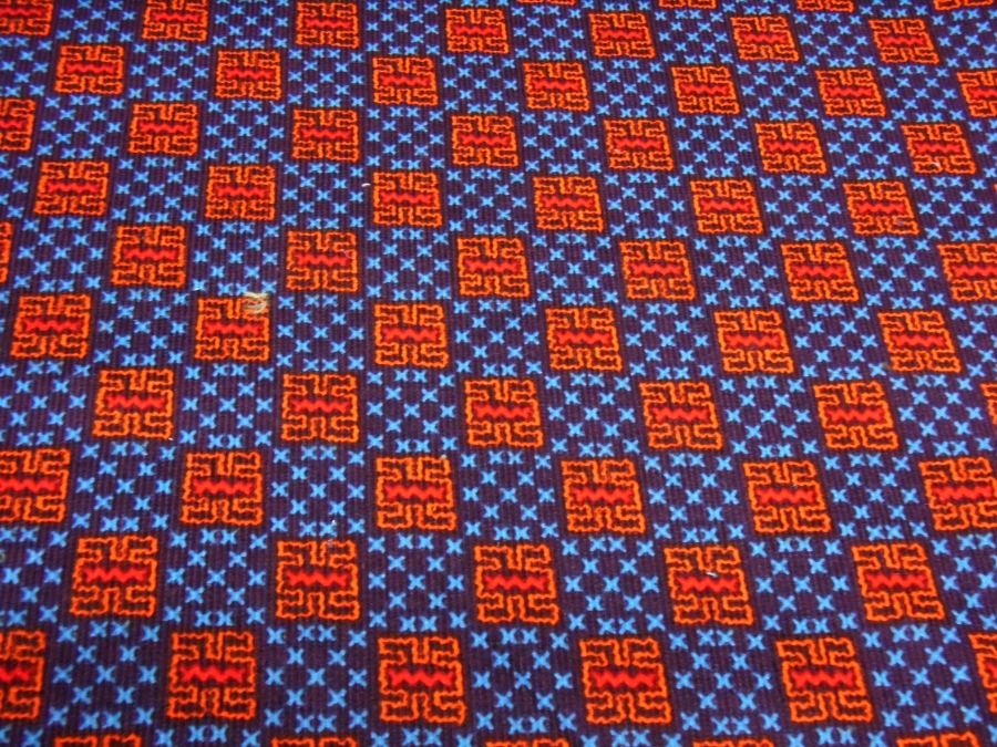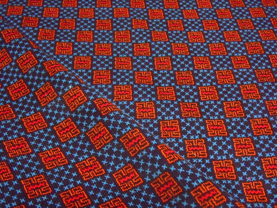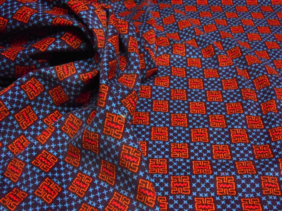 AUTENTICO VINTAGE ANNI ’70. PRADA STOCK (NO FIRMATO). FANTASIA FONDO BLU DISEGNI GEOMETRICI SUI TONI DEL ROSSO. INDICATO PER PANTALONI GIACCHE SOPRABITI, ECC..